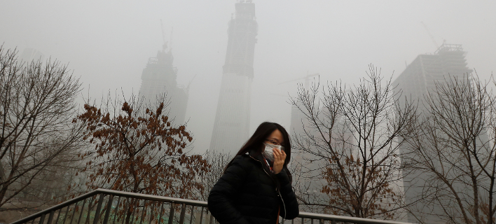 Γυναίκα προσπαθεί να προστατευθεί από την ατμοσφαιρική ρύπανση στο Πεκίνο / Φωτογραφία: ΑΡ