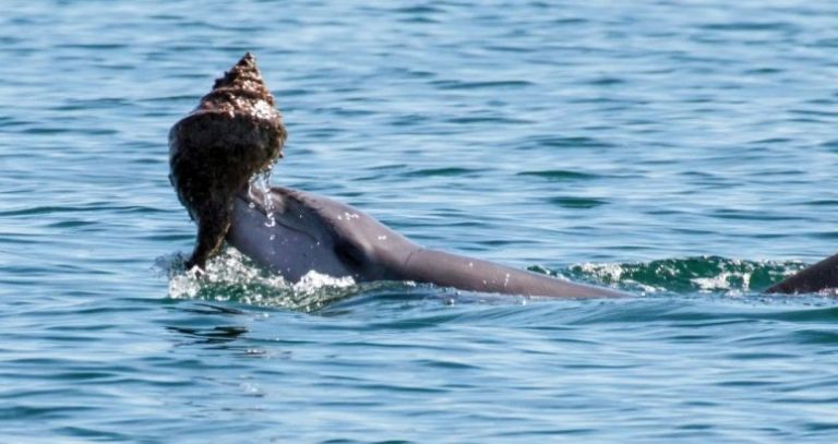 Είναι σπάνιο να το έχει παρατηρήσει κανείς, όμως συμβαίνει στην κοινότητα των πολύ συμπαθητικών δελφινιών: μέλη τα οποία αφού γαντζώσουν στο ρύγχος τους ένα άδειο κοχύλι παγιδεύουν στο εσωτερικό του ψάρια, βγαίνουν στην επιφάνεια της θάλασσας και αδειάζουν το περιεχόμενο του κοχυλιού στο στόμα τους.